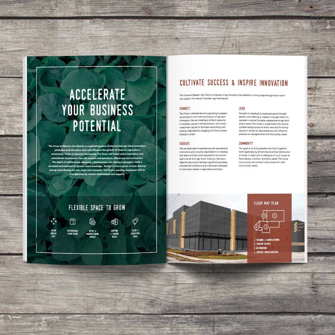 When it came to naming and branding The Grove, who better than the creative bunch at adHOME, a team known for taking seeds of ideas and nurturing them into full, locally-grown campaigns. We came up with The Grove’s name as a nod to Salter’s Grove, a parkland of trees in the 1870s on the site of today’s Western Fair District, a perfect place where the soil is as rich as its agricultural history. We’re especially proud of the logo we designed. It celebrates the District’s agricultural roots as well as their promising future. Our strategy was to combine an organic, vintage look from the era of handmade items, as seen in the typeface, together with a clean, modern icon representative of today’s innovative technologies.